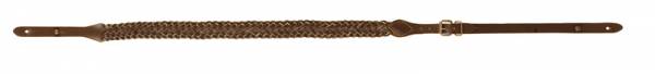 Bretelle en crôute de cuir tressée à 7 brins, longueur 110 centimètres, réglable à 5 positions avec bouclette laitonnée.