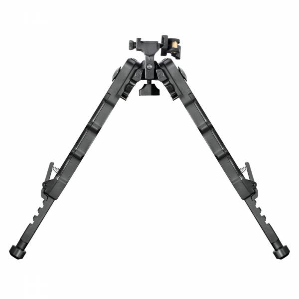Bipied Umarex modèle Combipod réglable en hauteur de 19,5 à 23,5 cms ( 5 positions ), pivotant permettant le tir sur terrains inégaux. En aluminium anodisé noir mat. Jambes verrouillables sur 5 angles différents de l'avant à l'arrière. Poids 334 grammes. Montage rapide sur rail Picatinny avec serrage par levier.