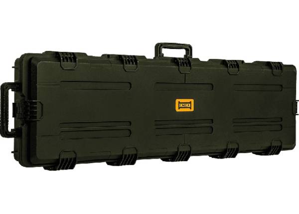 Mallette Tacstack XL Green. 7 fermetures solides et deux poignées de transport . 2 emplacements pour cadenas. Coloris vert foncé, cotes intérieures : 131 x 34 x 12,5 cms. Équipée de mousses alvéolées intérieures dessus / dessous et d' un bouton de dépressurisation / décompression permettant de garder la mallette " sous vide ". Roulettes pour déplacements facilités.