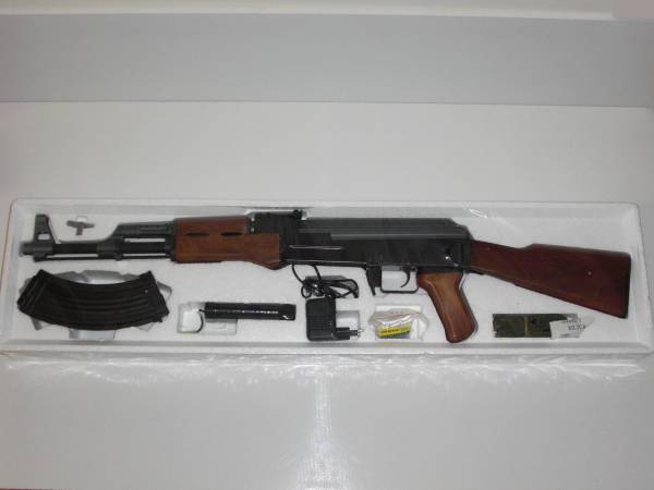 Réplique à billes 6 millimètres de fusil d'assaut modèle Kalashnikoff SA M7. Electrique à moteur fonctionnant sur accus 8,4 volts. Chargeur 300 billes. Livré avec adaptateur secteur, bretelle et sachet de 250 billes 0,20 gramme.