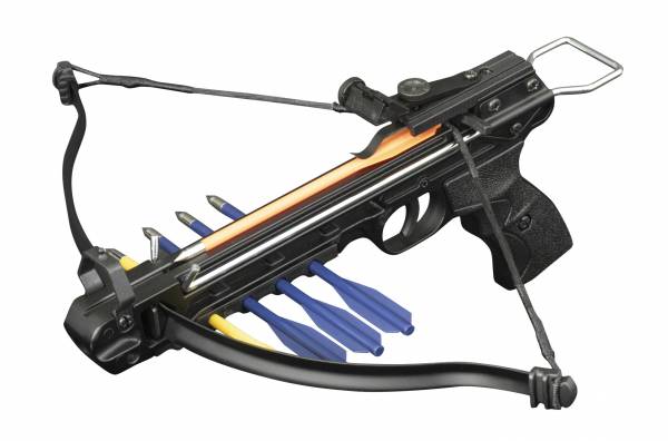 Pistolet - arbalète Man Kung modèle MK- 50 A2 / SPL. Armement par étrier arrière. Arc métallique de 50 livres de poussée. Livré avec 5 mini - traits à pointes métal. Envergure 42 centimètres, poids 650 grammes. Catégorie D 2. VENTE LIBRE CNI obligatoire.