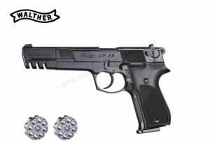 Pistolet Umarex modèle WALTHER CP 88 Compétition à CO² tout en métal noir. Calibre 4,5 MM ( .177 ) à plomb, capacité 8 coups, puissance < 4 joules. Canon de 5,6 pouces ( 140 millimètres ), fonctionnement simple et double action. Longueur totale : 230 MM. Livré dans une mallette en ABS rigide avec 2 barillets 8 coups. Catégorie D 2. Vente libre aux majeurs. CNI obligatoire.