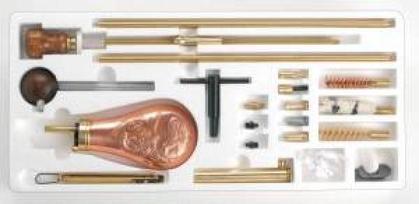 Coffret complet permettant le chargement et l' entretien de toutes les répliques à poudre noire, allant du revolver calibre 36 ou 44 jusqu' au mousquet calibre 45 ou 50 à chargement par la bouche.