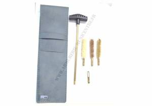 Kit de nettoyage pour calibres 44 et 45 à poudre noire. Livré en étui peau ou skaï à rabat. Composé d' une robuste baguette en laiton à poignée tournante, de trois écouvillons dont un métallique en bronze, et d' un tire - chiffon. Consommables disponibles sur cette page.