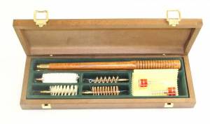 Coffret de nettoyage pour armes en calibre 12 composé d' une baguette en bois verni, de 4 écouvillons : laine, nylon, bronze, fil torsadé, de 2 douilles amortisseuses et d' un chiffon.