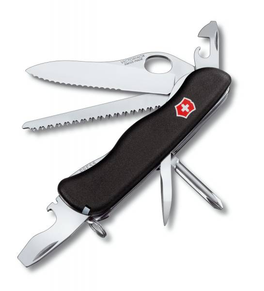 Couteau Victorinox modèle Trailmaster, manche noir, 8 fonctions. Lame crantée, tournevis plat et cruciforme, décapsuleur et ouvre - boites, poinçon, scie, pince à épiler et cure - dents. Anneau de portage. Catégorie D 2. VENTE LIBRE CNI obligatoire.