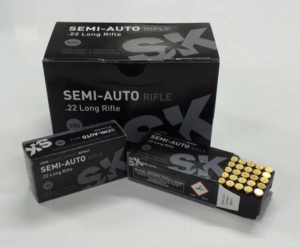 Cartouches calibre 22 Long Rifle SK Semi Auto à balles plomb graissées de 40 grains, haute vitesse. Idéales pour le tir d' entrainement à la cible avec des armes semi automatiques. Pack de 500 cartouches, soit 10 boites de 50. Catégorie C, vente sur justificatifs.