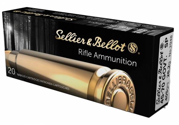 Cartouches de grande chasse Sellier & Bellot calibre 45 - 70 Government à balles de 405 grains ( 26,2 grammes ) profil Soft Point. Vendues en boites de 20 cartouches. Catégorie C, vente sur justificatifs.