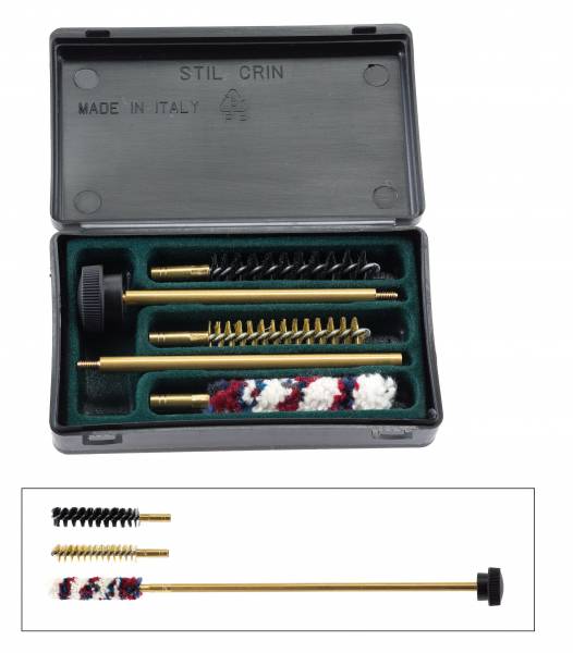 Kit de nettoyage pour pistolets et revolvers calibre 22 LR. Poignée et baguette laiton 2 parties. Ecouvillons laiton, nylon et laine fournis. Livré en plumier plastique.