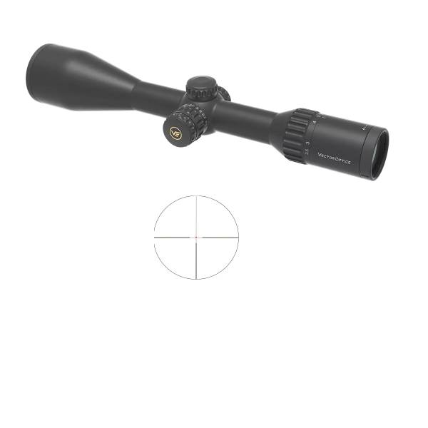 Lunette VectorOptics série Contiental, grossissement de 2,5 à 15 fois, objectif de 56 MM. Réticule German N°4 ( croix fine avec point central illuminé rouge ). tourelles graduées sous capot. Corps de 30 MM, longueur 369 MM, poids 670 grammes. 110 Moa d'amplitude de réglage en élévation et dérive, clics de 1/4 Moa. Livrée avec ses colliers de montage au standard Picatinny, son bikini et un pare soleil. Réf SCOM-38.