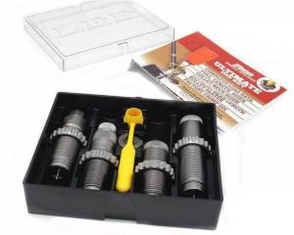 Jeu de quatre outils LEE Ultimate, composé d'un recalibreur intégral, un recalibreur de collet, un positionneur de balle et d'un factory crimp, livré avec le shell holder dédié et une dosette à poudre. Le jeu d'outils le plus complet du marché !