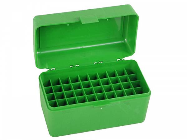 Boite de rangement MTM pour 50 cartouches des calibres 243, 6,5 Creedmoore,308 et 307 Winch, 7.08 Rem, 30 X 30, 300 Sav, 303 Br et Sporting, 7,62 Russian, etc ... Couleur verte.