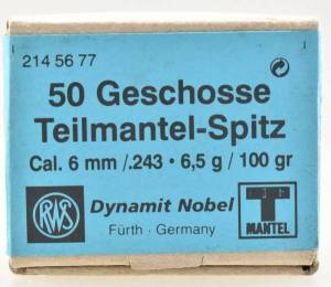 Ogives RWS 6 MM ( 243 millièmes de pouce ) pour rechargement des calibres 243 Winch., et autres 6 MM. Poids 6,5 grammes / 100 grains, profil TMS. Boite de 50 projectiles.