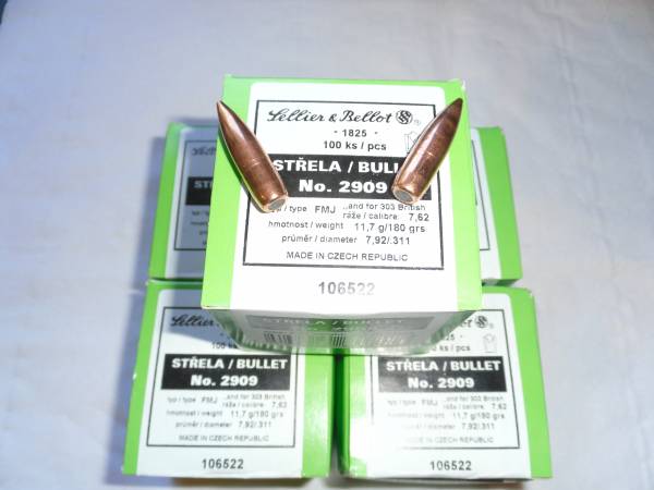 Ogives de tir Sellier & Bellot calibre .311 pour rechargement des cartouches de 7,62 X 54 R, 303 British ou 30 - 284 destinées à être tirées dans les Mosin Nagant, LEE Enfield et assimilés. Poids 180 grains ( 9,7 grammes ), blindées FMJ, gorge de sertissage . Vendues en boites de 100 projectiles.